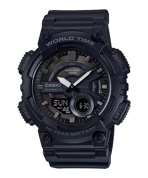 10-YEAR BATTERY LIFE & WORLD TIME • 100-meter water resistance • Monotone metallic 3D dial • Telememo 30