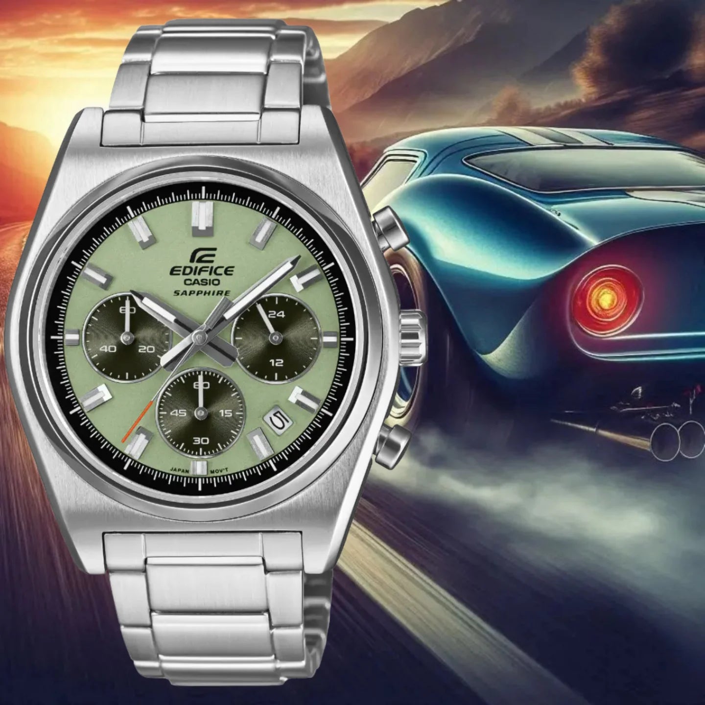 Introducing the EDIFICE motorsports chronograph inspired by the classic sportscar. Striking index bars join the legendary 3-6-9 inset dial layout in a time-honored sporty design. The smaller diameter of the case presents an elegant look of sheer speed. With sapphire crystal, stainless-steel case, and substantial stainless-steel band, this timepiece is water resistant up to 10 bars. This sporty, classic chronograph takes you from casual settings to business meetings in a split second.