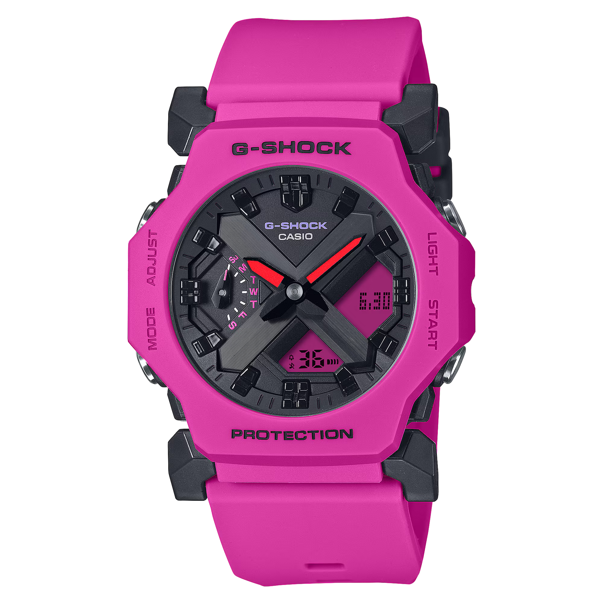 A compact G-SHOCK in a boldly straight-forward design that moves style into the future. The tough digital-analog combination GA-2300 goes smaller and slimmer to meet today’s needs, delivering just what you require from a watch in a minimalist design with a futuristic sensibility. With a case measuring just 45.4 mm in diameter and 11.6 mm slim, this G-SHOCK is significantly smaller than past models. Choose the GA-2300 in classic black or white, or go with the GA-2300-4A in vibrant pink with matching LCD.