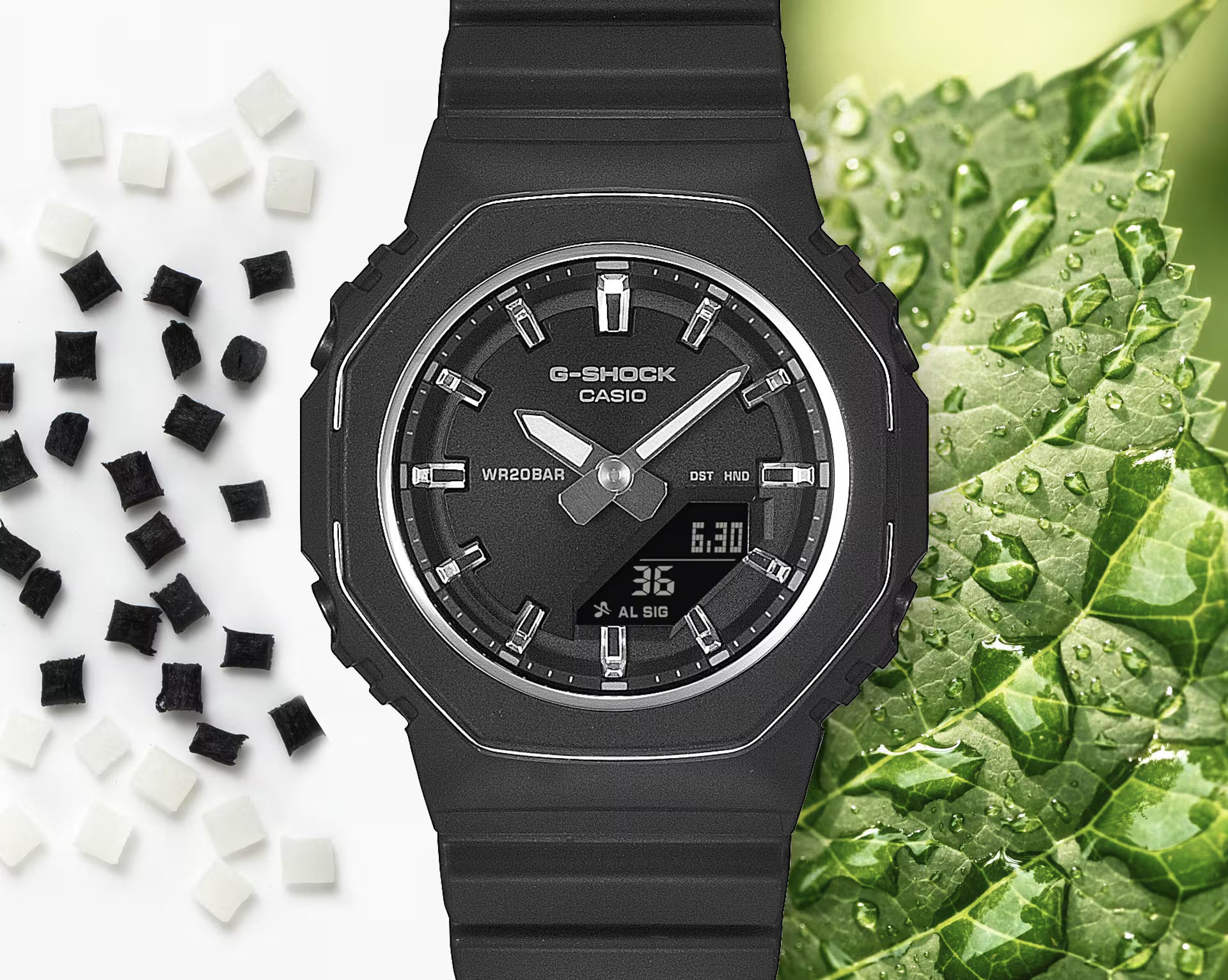 A real standout in the popular digital-analog line of G-SHOCK watches, the GMA-P2110 features a slim metallic ring that catches the light from both the inner and outer edges of the bezel. While comparable to the GMA-P2100 in compact size and comfortable fit, this watch adds an elegant, contemporary touch with the subtle shine of metallic accents. The streamlined bezel leaves out logos or mode indicator engravings for a cleaner, more minimalist finish. Bar indexes are shaped with sharper definition compared to those of the GMA-P2100 watches, adding to the watch’s refined, sophisticated feel. Available in black, beige pink, and white — versatile colors that easily complement anything you wear — the GMA-P2110 brings a clean, stylish accent to your street-ready look. Key components for the bezel and band are made with bio-based resin. Produced using renewable organic resources, this material is expected to help reduce environmental impact.