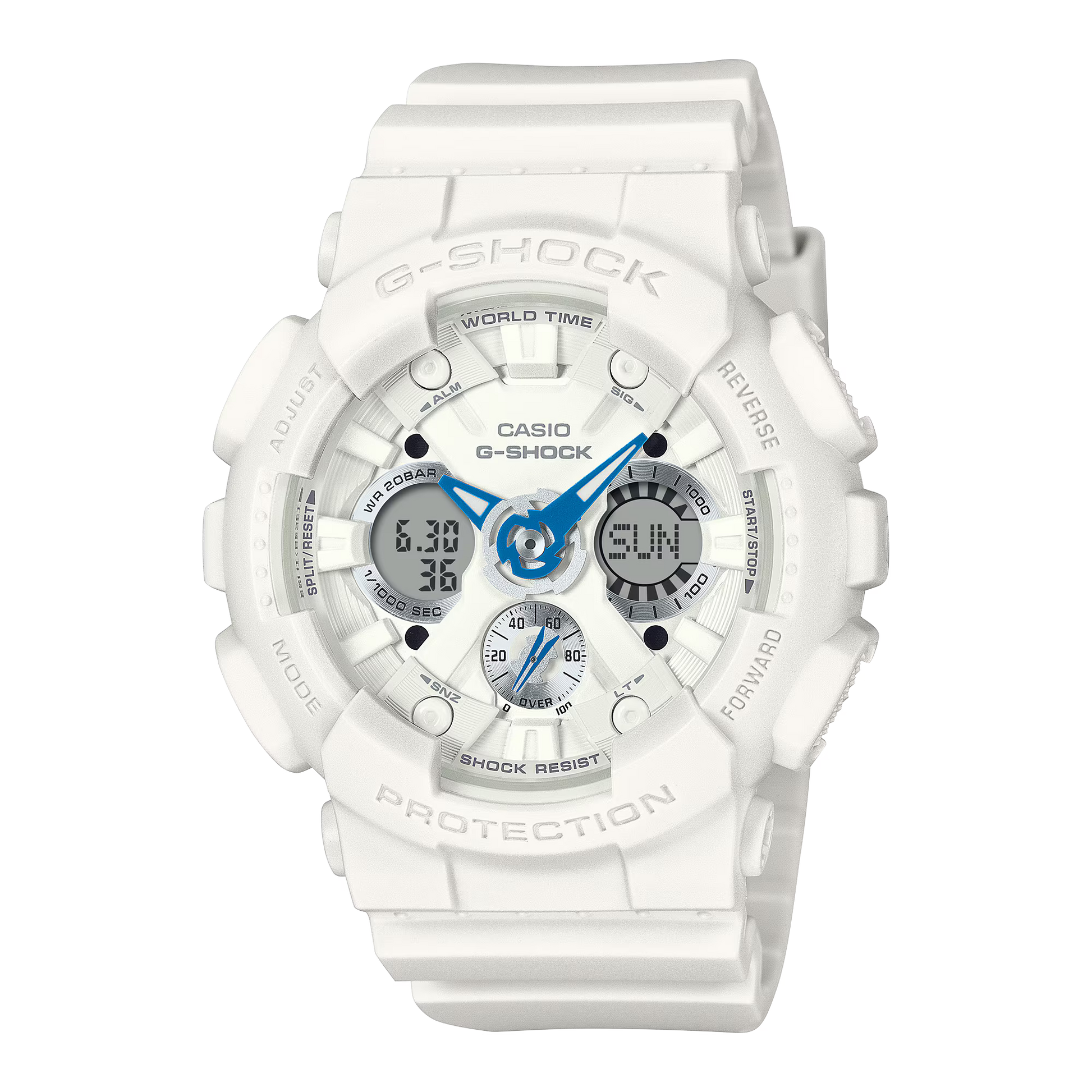 Make your statement cool, contemporary, and sporty, with vivid accent colors that pop. With the GMA-S120SA, we start with classic white and add accents in vibrant hues inspired by athletic gear to create a striking contrast that delivers full-on sporty style. Key resin components used in the bezel and band are made with bio-based resin. Produced using renewable organic resources, this material is expected to help reduce environmental impact. The watch features a distinctive dial with dimensional components for layered depth, finished in a crisp, pure white tone. The watch hands are accented in vibrant orange or blue and coated in phosphorescent white, bringing a refreshing sense of openness to those free and fun summer days.