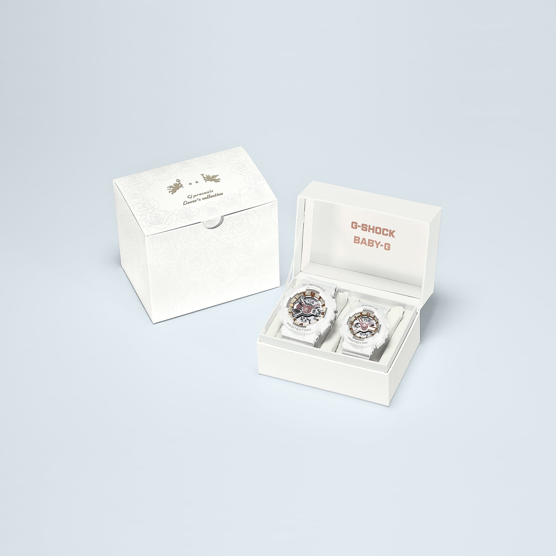 What could be more romantic than a gift of 99 roses? We carry on our 2024 rose theme with limited-edition Seasonal Pair Collection watches inspired by wintery white. We begin with the popular analog-digital GA-110 G-SHOCK and BA-110 BABY-G and dress them in the white-rose motif that symbolizes shared love. A rose decorates the G-SHOCK indicator hand and the BABY-G hour and minute hands, and both watches’ band loops are printed with two pearlescent roses. Three roses, signifying “I love you” in the language of flowers, adorn each watch. Taken together, the six roses mean “I’m crazy about you.” The angel and devil design, signifying the attraction of opposites, is engraved on the case back. The packaging likewise bursts with rose blooms. The 11 roses on the inner box convey “most beloved,” a meaningful sentiment for any couple. In total, the specially designed packaging and two watches feature 99 roses, symbolizing the eternal love that forever watches over the relationship between you and your special love.