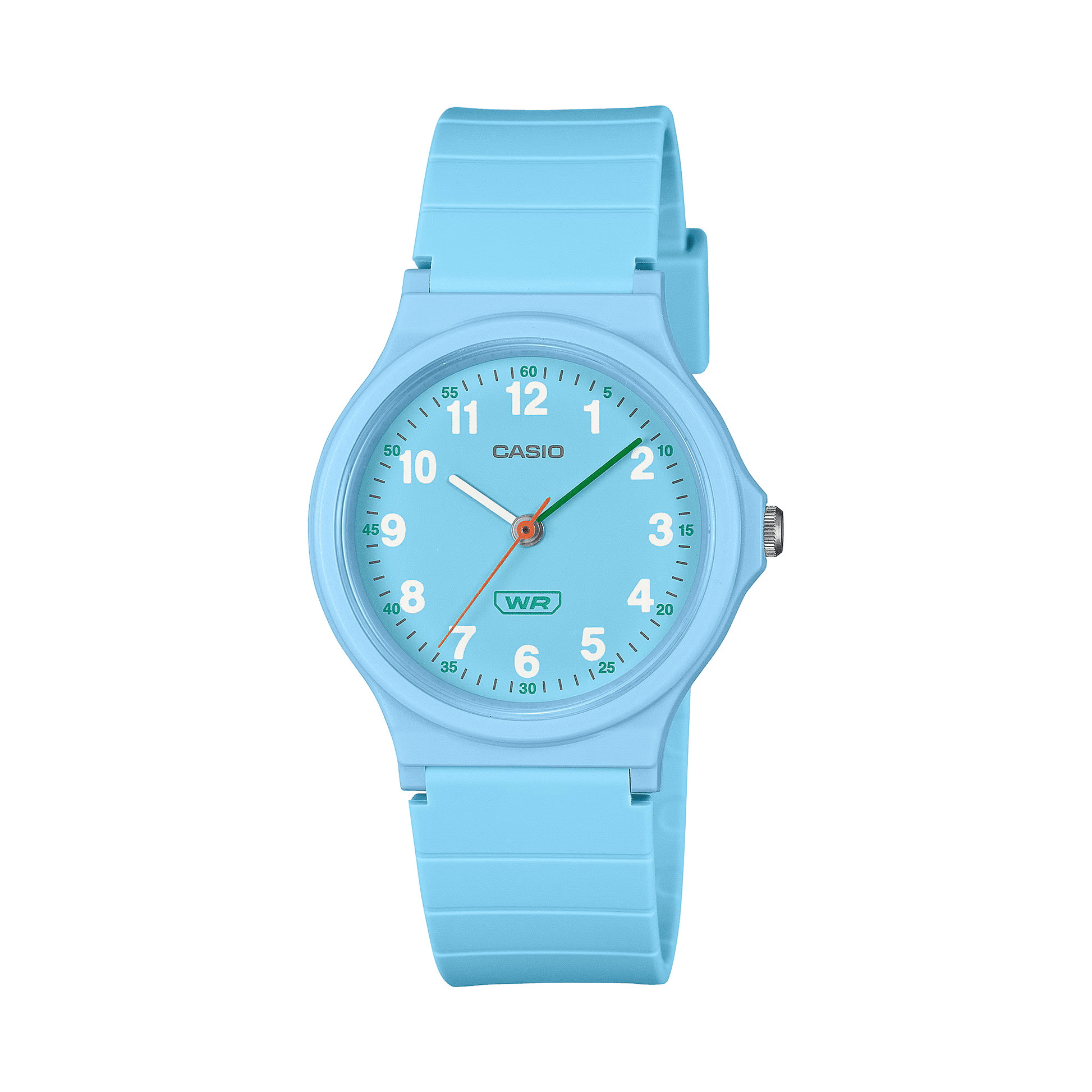 An analog watch with the classic look of hour, minute, and seconds hands in a smaller, easy-to-wear size. The hour and minute hands are colored to match the corresponding index marks, so it’s easy to tell time — making this an ideal first watch.