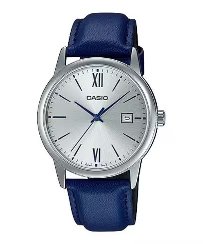 Style yourself for work or play with the MTP-V002 line of Casio dress watches. With the convenient date window at the 3 o'clock position and the classic, one-glance Roman numeral and bar indexes, you’ll be at the right place at the right time. Elegant and versatile, these timepieces are water resistant for daily use, freeing you from worry when out in the rain or washing up. Choose tradition with a metal link band. Or go more casual with a leather band, available in several colors.